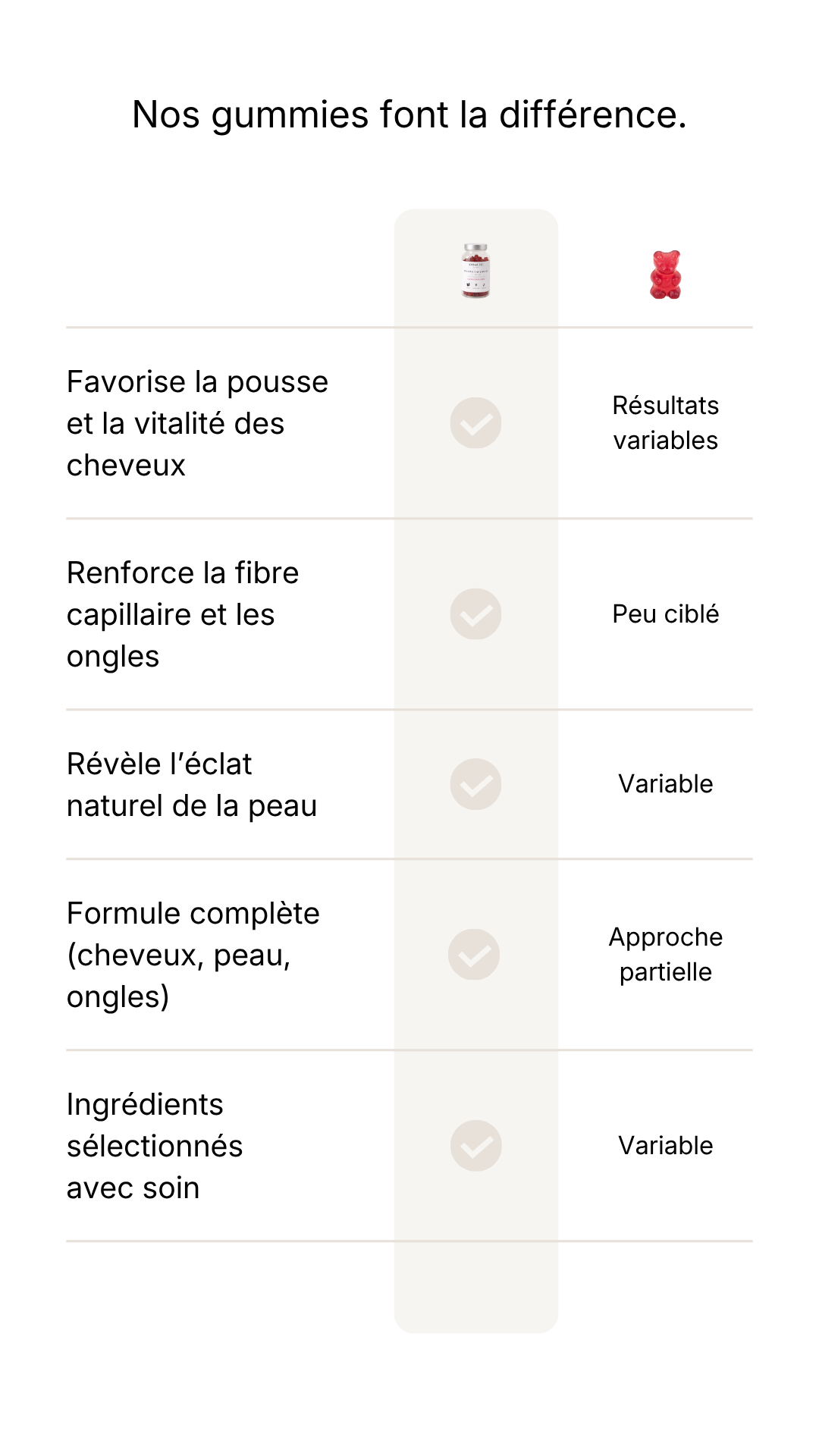 - Sélection rigoureuse des ingrédients : Chaque ingrédient est soigneusement sélectionné pour contribuer à la vitalité des cheveux, au renforcement des ongles et à l’éclat de la peau.
